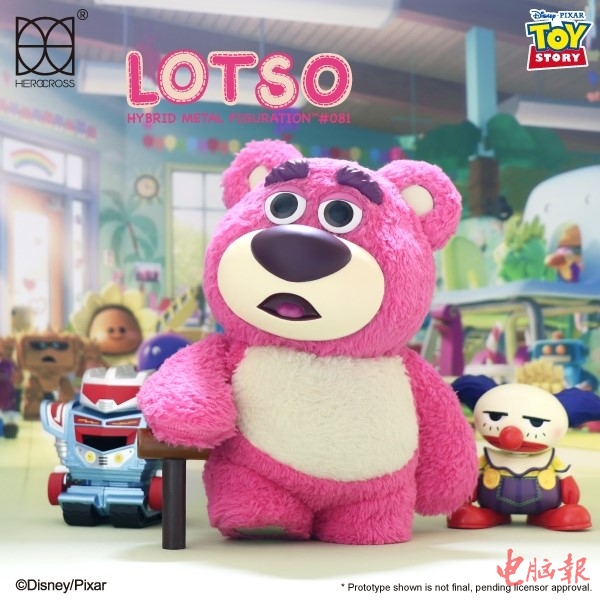 而草莓熊劳苏则以合金、ASB、PVC等材质打造,并把表面制成摸起来舒舒服服的毛绒质地,可以藉着替换嘴形与调整眉毛角度来展现不同的情绪状态,更附属一支带有磁性的手杖、机器人配件。