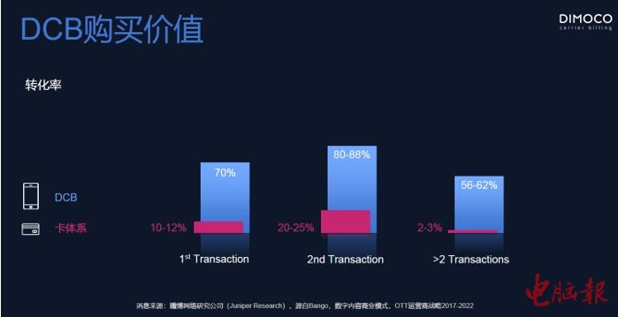 话费支付是人人触手可及的支付通道,比信用卡钱包通道普及率高出3-5倍;同时它也是海外备受欢迎的支付通道,仅次于信用卡。话费支付通道有几大好处:更能激发冲动型消费(特别适合出海的游戏,直播,网文),能吸引那些不愿在网上填写信用卡信息的玩家或者暂未有资格申请信用卡的年轻一代(扩大了付费群众基数),还大幅提高支付转化(通常是7-10倍于卡支付- 基于如下Juniper 研究报告)。