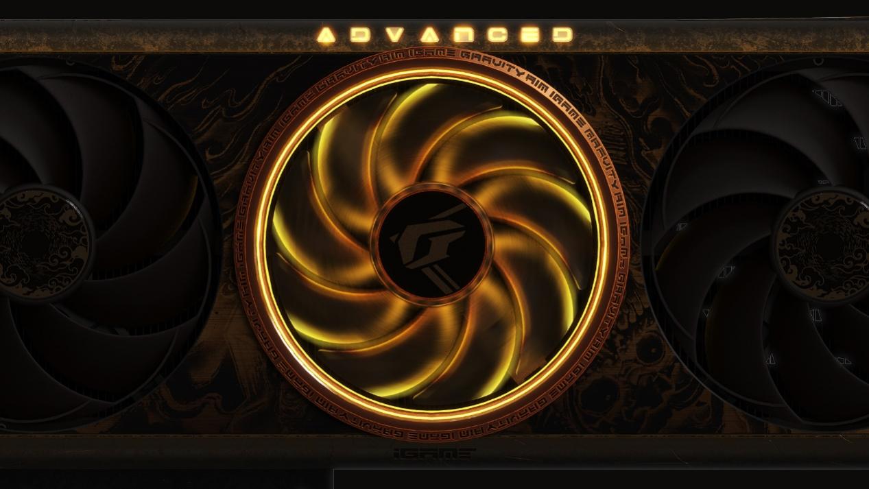 提及到iGame Advanced第一时间想到的就是标志性的“大红圈”,在RTX 40系列产品当中我们将它命名为「引力之环」,而在融入了《黑神话:悟空》的元素后,圆环经过多次的打磨及调色,最终进化成为「金刚圆环」,灵感来源法宝“金刚琢”,其质地坚硬如锟钢,经过精心铸造。点亮之后与RGB光环形成“双环”设计,可展现无与伦比的光影效果。当它与iGame Center的多样光效调控技术结合,即被赋予了生命的韵律,展现出令人着迷的灵动气息。同时,金刚圆环的设计还巧妙地融入了中间半透聚风扇叶,打造出一种“视觉停留”的效果,呈现以静制动的美感。