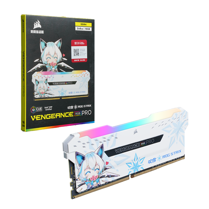 ROG吹雪系列主板的推出填补了高端白色系主板的市场,代表吹雪系列产品的二次元形象“雪武战姬”自推出以来便受到了玩家们的广泛欢迎。“雪武战姬”不仅推出了艳丽高冷的成人形象,也有更加惹人怜爱的Q版形象。而这次的联名版VENGEANCE RGB PRO内存,便是采用了喜闻乐见的“吹雪吃瓜”表情包。