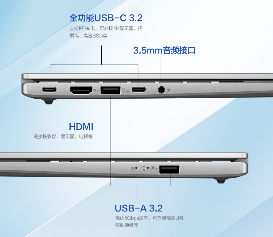 接口方面,机身配备了两个全功能USB-C口,两个USB-A大口,一个HDMI口以及一个3.5mm音频口,满足日常扩展需求。