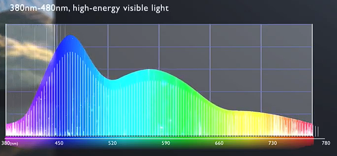 防蓝光可以说是目前最热门的“护眼”技术了。蓝光对于眼睛的危害性,主要是在于对人类来说,可见光光谱的波长为380-780nm,而蓝光处于380-480nm范围,且能量最高,可以轻易到达眼底引起眼底黄斑病变。