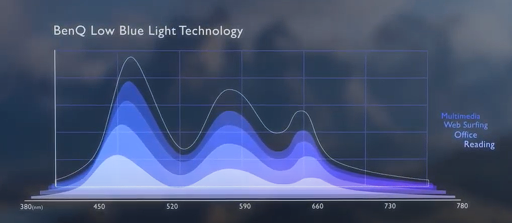 采用硬件降低蓝光和四种模式调光后,BenQ Low Blue Light技术的显示器的可见光光谱能量对照