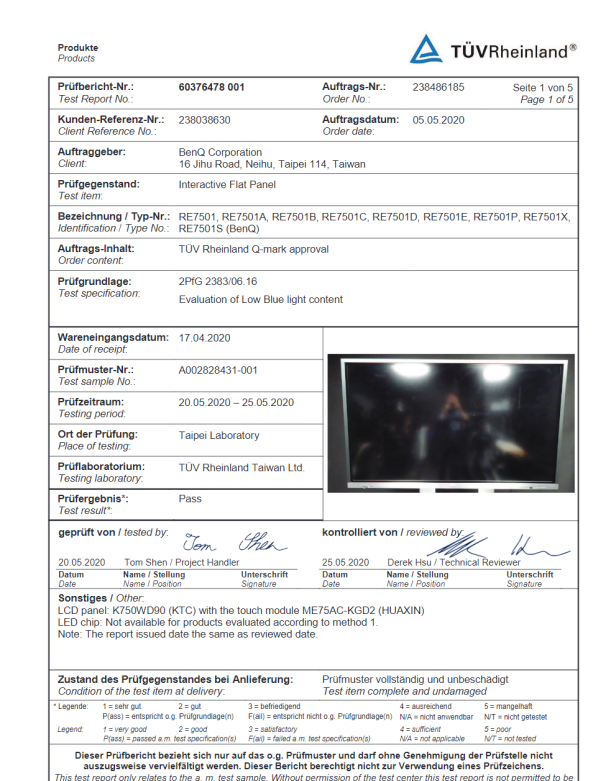 而在人体工学中,认证要求显示器必须便于侧面和上下移动,低于3公斤的显示器必须面板可以倾斜,小于24英寸的显示器必须上下可调。而在显示质量环节,它主要参照了自己的人体工学GS MARK、ERGO MARK标准,以及国际通用的ISO 9241-307/308/309。在最重要的健康保护方面,主要是通过两个标准测试,即不闪屏测试2PfG 1797和低蓝光测试2PfG 2383。下图分别是两款BenQ显示器的纸质不闪屏测试和低蓝光测试认证报告。