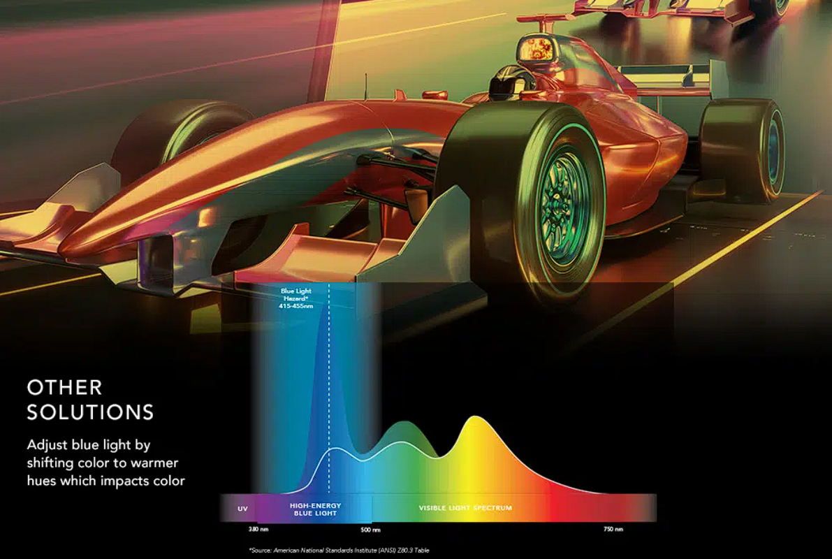 著名的TUV莱茵认证机构在认证中发现,这种偏软解决方案基本都是直接把蓝光波长区的颜色直接变成了暖色,严重影响色准
