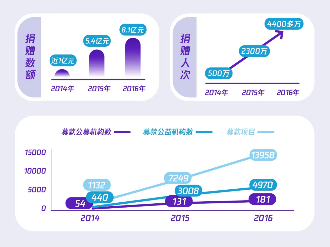 回顾三项数据十年来的详细变化,会发现2015年、2016年是该平台两个飞跃性变化的节点:2014年,用户捐赠数额逼近1亿元,2015年、2016年分别快速增长到超过5.4元亿和超过8.1亿元,2017年更是突破了16亿元;在捐赠人次方面,2015年从2014年的500多万快速增长到2300多万,2016年又增长到4400多万,同比增长了87.7%。