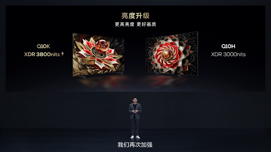 在亮度方面,Q10K的升级更加明显。原本上一代产品Q10H的XDR 3000nits亮度,已经远超只有2000nits的同价位段行业平均水平,而本次Q10K再次扩大领先优势,98/85/75三个尺寸亮度均提升至XDR 3800nits,65英寸电视的亮度也提升至XDR 3500nits,同时,Q10H的动态对比度高达3800万比1,层次更分明,细节更清晰。
