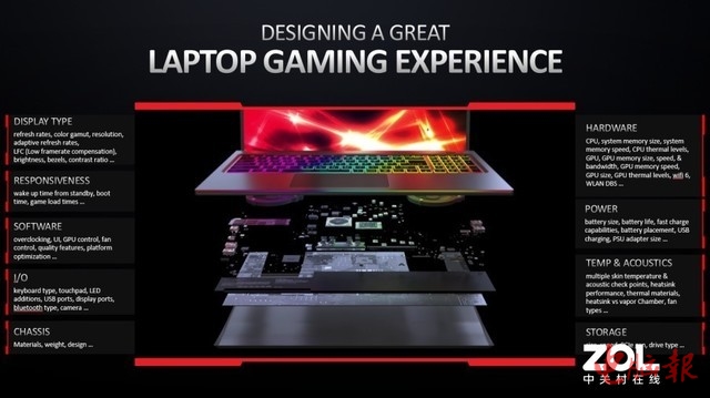 为游戏而生的AMD Advantage设计框架,针对游戏本的方方面面做了细尽的要求,涵盖机身、显示屏、硬件配置、输入输出、软件控制与优化、系统与游戏响应、供电充电和续航、温度与噪音等等关键因素,每一个细节都事关游戏本的应用体验,可以归结为三大关键指标: