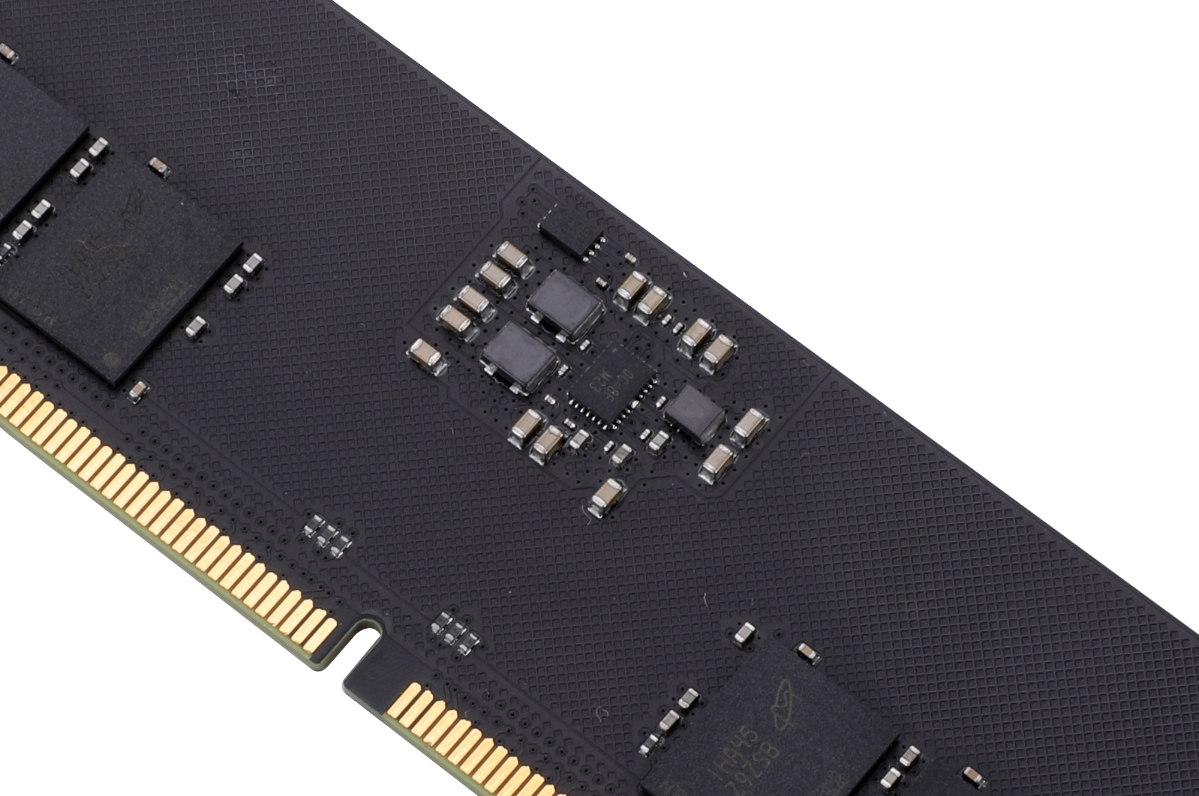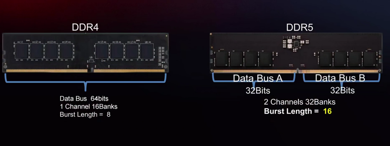 如果用户能够看到DDR5内存的裸条,会发现对比起DDR4,DDR5多了一组电子元器件。这组元器件便是电源管理IC,将原本在主板的元器件直接转移到来内存上,让内存能够独立自主的控制电压。DDR5的常见电压也因此降低到1.1V。对于电源管理IC,普通用户可能感知不大,但是对于喜爱超频的用户,将来以更低的电压去超频也是能够实现的。