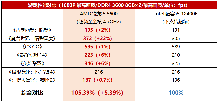 从游戏性能实测来看,全核超频到4.7GHz的锐龙5 5600优势明显。从表中可以看到,在超频BUFF的加持下,锐龙5 5600的《魔兽世界:暗影国度》的帧率甚至高出酷睿i5 12400F 22%之多,综合7款游戏来看优势达到了5.39%。