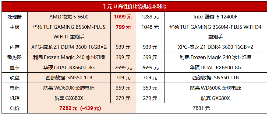 综上所述,如果你要组装一套6核性价比主机,通吃当下游戏大作和日常工作应用,那么选择锐龙5 5600的方案明显更加合理。这里我们也为大家做了定位相同的两套配置对比,可以看到,锐龙5 5600这套配置不但性能更强,装机总价也有439元的优势(这价差已经可以多买一块500GB的SSD了),明显性价比更高。此外,618大促AMD还将有更多的优惠大招,大家可以保持关注,以最佳的价格入手锐龙5 5600这款6核性价比小王子!