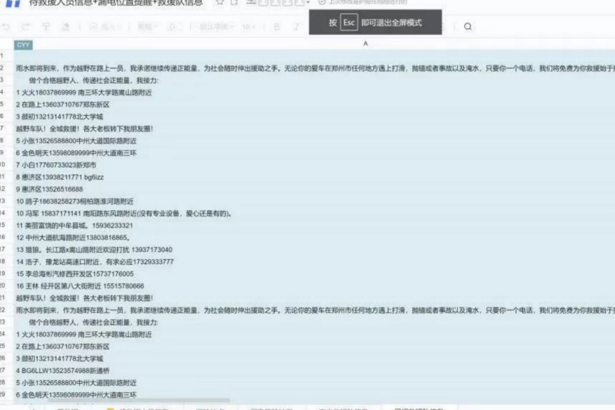 2021年7月,河南全省突发大范围强降雨,使多地遭遇特大水灾。一份名为《待救援人员信息》的腾讯文档受到人们的关注。这份文档将求救人员和救援人员的信息在线不断整理、核实和更新,进入文档者可进行编辑、查看。仅仅一天多时间,文档已“自发”更新了第 270 余版,访问量达 650 多万次,它也因此成为一个民间抗洪资源信息平台。文档中一个个醒目标记的“待救援”信息被横线划掉,该文档被网友们称为"救命文档"。