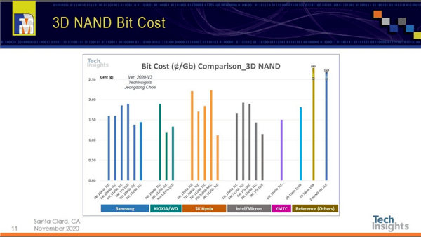 那闪存的成本到底有多低呢?去年的FMS大会上,调研机构Techinsights分析了各大闪存厂商的闪存成本,除了三星、铠侠/西数、SK海力士、美光/Intel之外,甚至还有国产的YMTC长江存储公司的闪存成本情况。