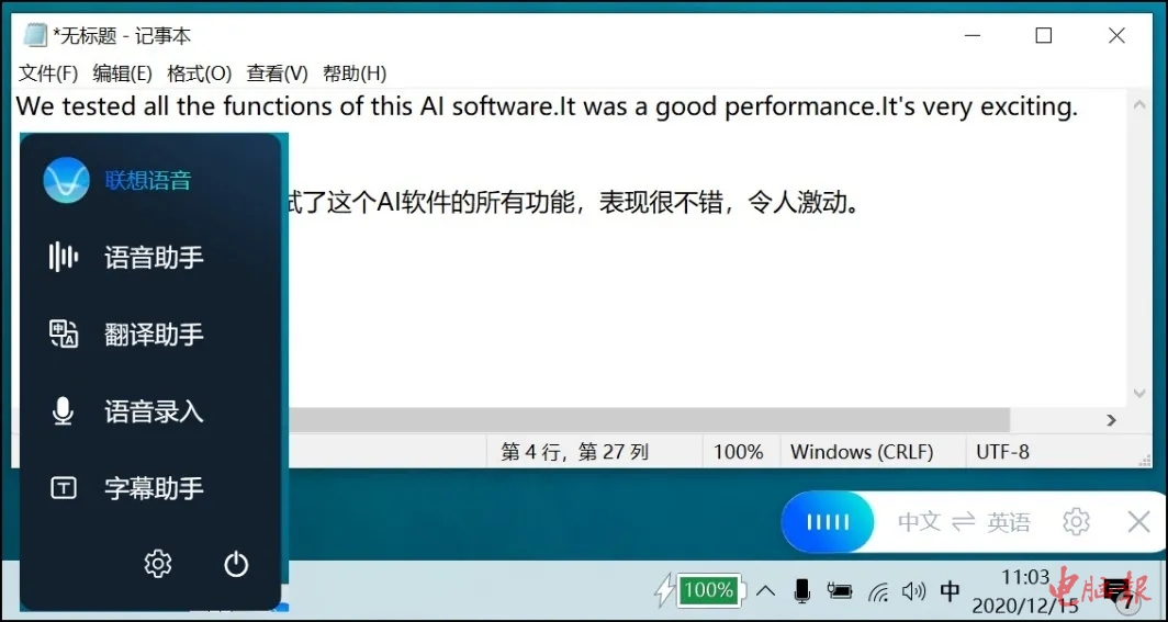 其三是智能化应用。EVO认证轻薄本为我们展示了大量笔记本的本地化智能应用。华硕的多设备协同套件MyASUS、戴尔的协同软件Dell Mobile Connect,联想的智能语音助手《联想语音》是三个非常典型的代表。前两者能将笔记本电脑与手机、平板连接,能在电脑上打电话,也能将手机上的文件(图片、视频等)通过拖拽拷贝到笔记本上。而《联想语音》则主要围绕智能化的语音功能进行创新,不仅可实现实时的中中、中英、英中、英英语音→文字录入,还带有智能语音引擎,可实现语音助手功能,启动应用,查询信息,甚至还能实现视频字幕的实时翻译。