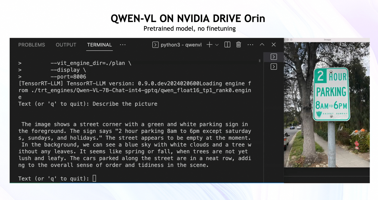 跑在NVIDIA DRIVE Orin芯片上的Qwen-VL,可以自动识别右侧画面信息,并回答用户的提问,如“我可以在这停车吗?”