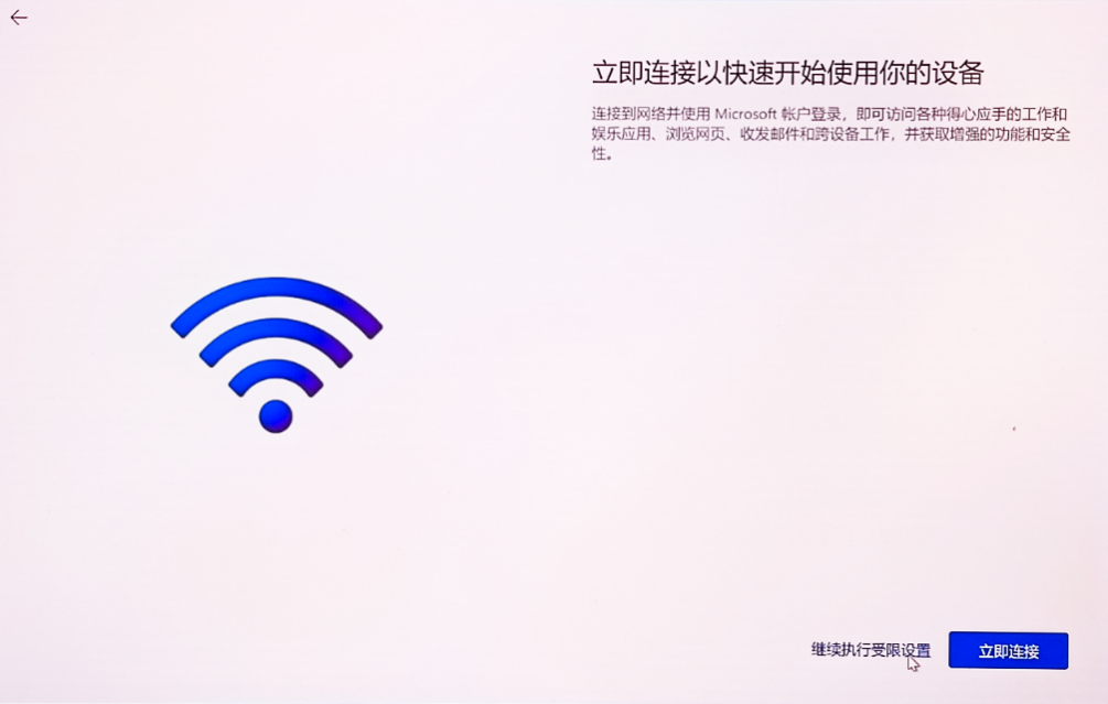 重启完成后,再次来到联网界面,我们可以看到右下角的“下一步”按钮旁多出了一个“我没有Internet连接”的选项,点击该选项。在新的界面中,继续点击右下角的“继续执行受限设置”,到此就完成了跳过联网激活的环节。该方法不涉及关闭任务管理器进程关闭的操作,总体来说更加简单直接。