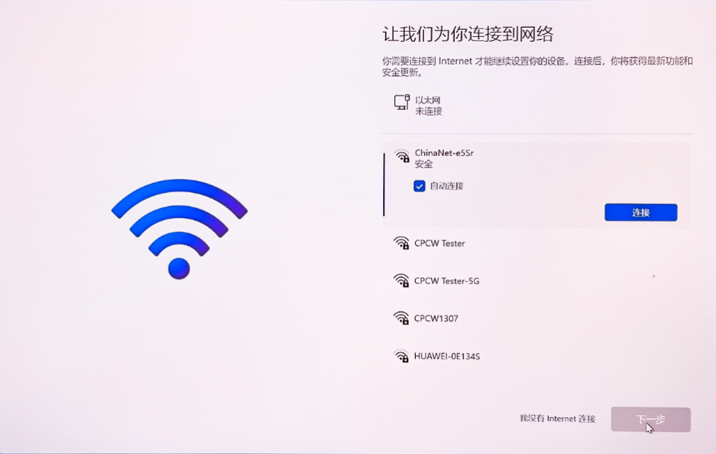 第一次开机之后,跳过前面两个设置,我们来到联网界面,和win10不同的是,这个界面并没有预设跳过的按钮,开机重启也无法直接跳过这个步骤,所以我们要通过特殊方式避过这个环节。大家可以先尝试使用之前文章的方法: