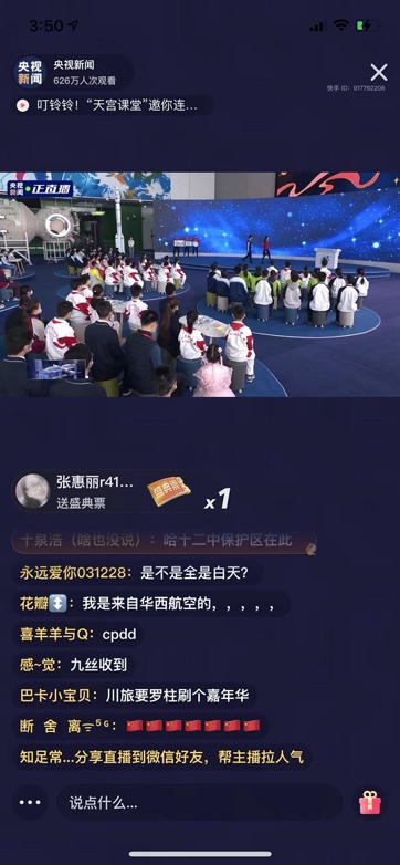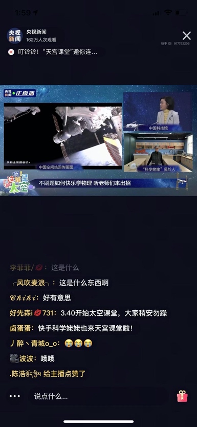 自快手走红后,被人民日报、央视新闻等众多媒体接连报道的“快手科学姥姥”也参加了此次直播连线,为全国观众带来了一堂别开生面的“太空物理课”。