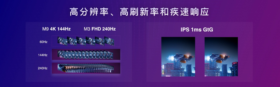 同时,M9搭载144Hz刷新率屏幕,配合VRR可变刷新频率,可以动态调整显示器刷新率、消除图像撕裂,使M9得以呈现更平滑的运动图像。同时,IPS 1ms灰阶响应时间(GTG)可让玩家的指令迅速得到响应。