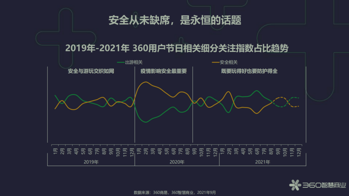 《报告》显示,从2019年到2021年,360用户节日相关细分关注中,安全是永恒话题。人们在出行之前,往往更为关注目的地防疫相关要求,并自觉做好防护,实现快乐出行、安全出行。