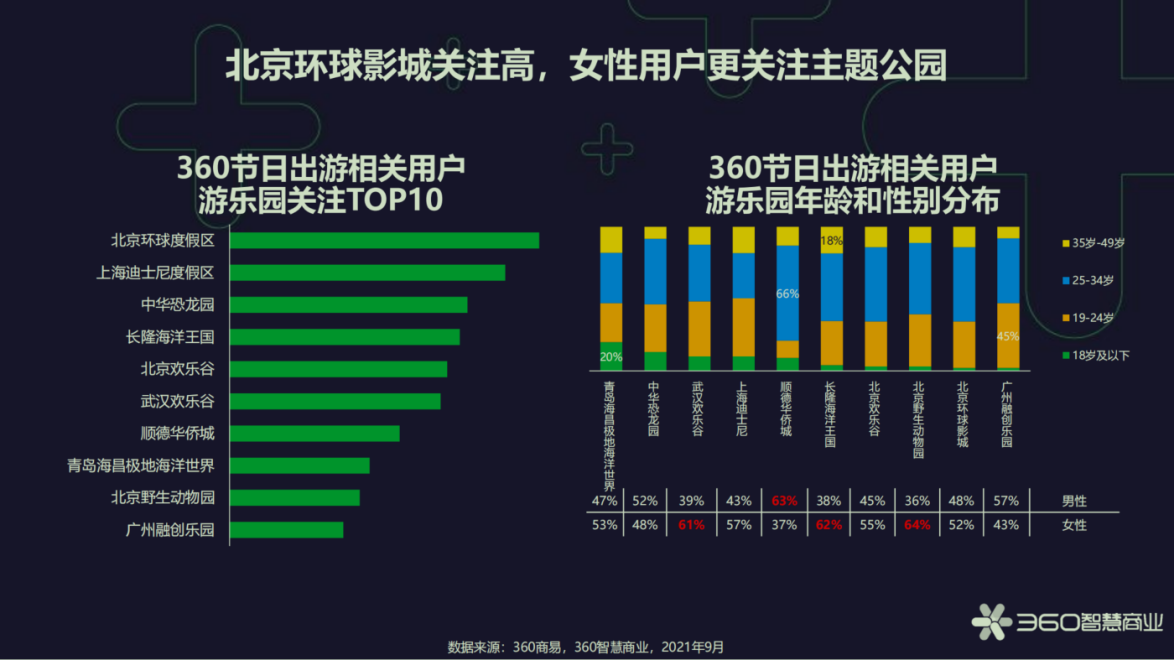 今年节假日“方特”、“环球影城”、“天气”、“国潮”等词成为360用户节日出游相关搜索的热词。在备受关注的游乐园Top10榜单中,北京环球度假区毫无悬念占据了榜首,紧随其后的是上海迪士尼度假区、中华恐龙园、长隆海洋王国、北京欢乐谷。其中,女性对于主题公园的热情明显高于男性,游乐园关注用户的主力军为25-34岁年龄段人群。除了游乐园外,《报告》还发现了假期出行的另一重要趋势,随着爱国热情的持续高涨,红色旅游成为度假目的地的大热选择,六成年轻群体关注延安革命纪念馆。