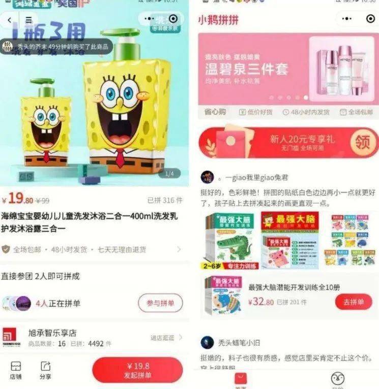 推出小程序后,小鹅拼拼还陆续推出了“5.5购物节”“618小鹅群购节”“腾讯小鹅拼拼,价格真的五折”等促销活动。同年6月,“小鹅拼拼”还上线了微信 “群小店”功能,微信群开通该功能后,当有群友购买商品后,平台会为群成员和群主发放津贴奖励。