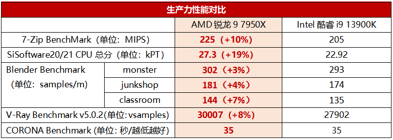 以上这些改进让锐龙9 7950X拥有了极为强大的性能。从实测部分的数据可以看到,锐龙9 7950X的综合生产力性能领先酷睿i9 13900K大约7%,效率明显更胜一筹。而比酷睿i9 13900K便宜1700元的优势也使得用户在同预算装机的前提下可以选择更强的显卡或者是更大的内存和硬盘,进一步提升整机的生产力性能和工作效率。同时锐龙9 7950X的游戏表现同样可圈可点,综合来说锐龙9 7950X是更有性价比的极致性能之选。