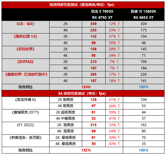 就实际游戏表现而言,锐龙5 7600X平台的电竞网游性能领先酷睿i5 13600K大约24%,差不多高出两个档次。相对电竞网游,3A游戏对于显卡的压力变得更大,此时锐龙5 7600X性价比间接带来的显卡优势就发挥得更明显了,RX 6750 XT显然高出RX 6650 XT一大截,锐龙5 7600X平台的综合优势进一步提升到了32%。由此可见锐龙5 7600X就是当前中端市场性价比最高的处理器。