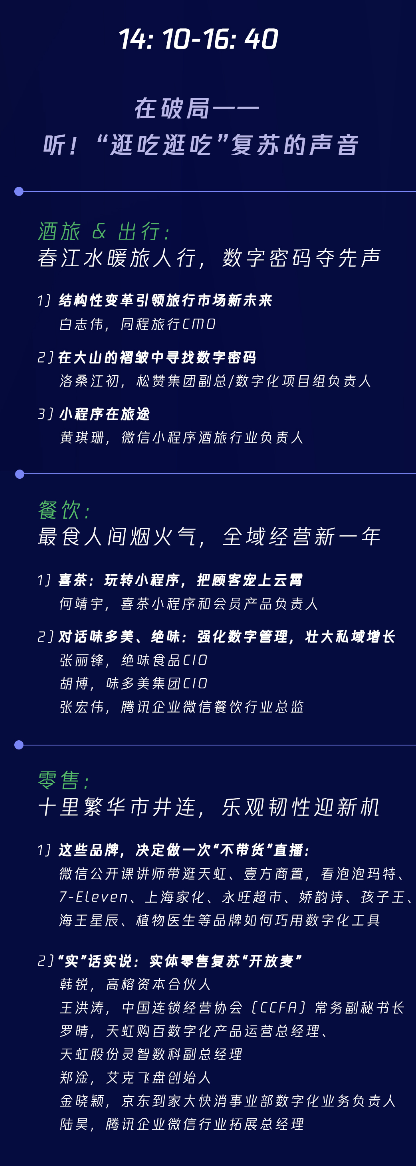 在酒旅出行部分,同程旅行CMO白志伟、松赞集团副总洛桑江初,微信小程序酒旅行业负责人从行业变革、酒店数字化创新等方面分享酒旅行业数字化进程与复苏。在餐饮专场,喜茶、味多美以及绝味鸭脖的相关负责人将同微信行业负责人一起,共论全域经营新一年。
