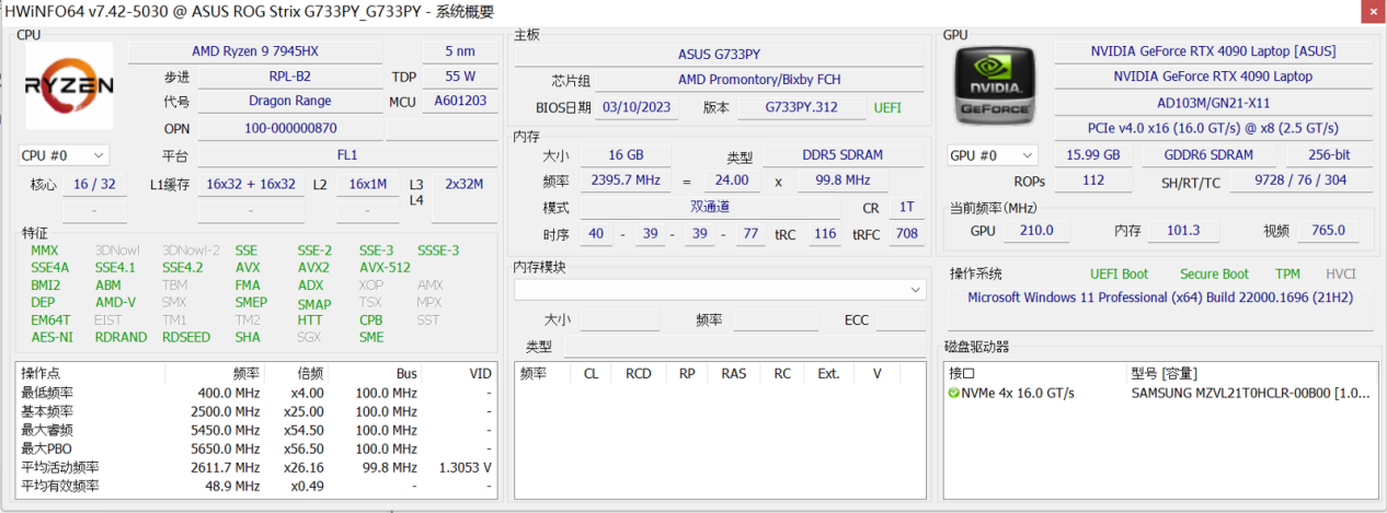 在配置上,ROG魔霸7 PLUS超能版的最大看点在于锐龙9 7945HX+RTX 4090+双通道DDR5 16GB内存+1TB PCIe 4.0 SSD等旗舰硬件的强强联合。其中锐龙9 7945HX是主打高性能的7045HX系列的旗舰型号,采用了最新5nm工艺和Zen 4架构,能效比优势更强,并拥有16核32线程的高规格,由于所有核心均为大核,性能更强悍且不存在任务的调用问题,兼容性上无疑会更出色。同时锐龙9 7945HX的最高加速频率达到了5.4GHz,再加上16MB二级缓存和64MB三级缓存,处理器规格非常强悍。