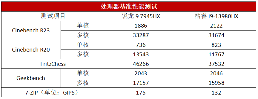 为了让大家了解锐龙9 7945HX的性能水平,在处理器基准性能测试中我们还引入了搭载酷睿i9-13980HX的笔记本来进行对比。