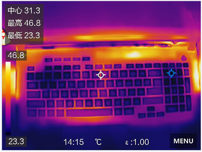 与此同时,即便在双考测试中机身温度上升以后,由于键盘在常用按键周围开有小型进气孔的设计,可以看到这些常用按键都能保持较低的温度,确保凉爽舒适的手感。在日常游戏中,虽说风扇噪音有所增加,但个人并没有无法忍受的感觉,不会影响到游戏体验。