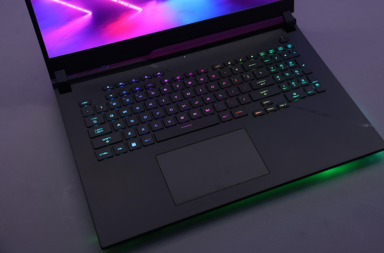 同时ROG魔霸7 PLUS超能版在A面ROG大LOGO(白灯)、键盘、以及底部(RGB灯)均设置了灯光效果,开机之后能带来流光溢彩的效果,还能和ROG全套外设实现联动。当然如果你追求极致的个性,还可通过单键RGB灯光设置功能,尽情发挥自身创意,打造专属个人的炫彩效果,这无疑就是让游戏玩家着迷的电竞氛围。