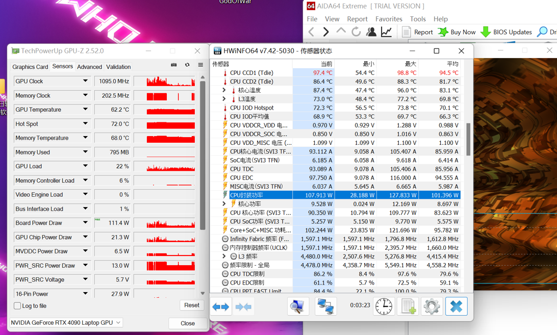 在单烤FPU测试中,笔记本的风扇模式为增强模式,锐龙9 7945HX能实现最高127W,稳定输出110W以上的功率,表明在ROG魔霸7 PLUS超能版上,该处理器能够实现满血输出。