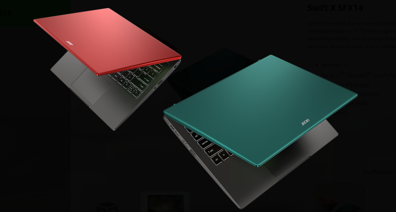●14英寸版的宏碁非凡X重量约1.4kg,机身厚度大概1.79公分,处理器最高可选第12代酷睿i7以及可选NVIDIA GeForce RTX 3050 Ti独显,搭配16GB DDR5内存,屏幕则是14英寸16: 10比例, 2240x1400分辨率,100% sRGB 色域,亮度最高 400 尼特,内置两个M.2 SSD硬盘位,具备多彩机身外壳。