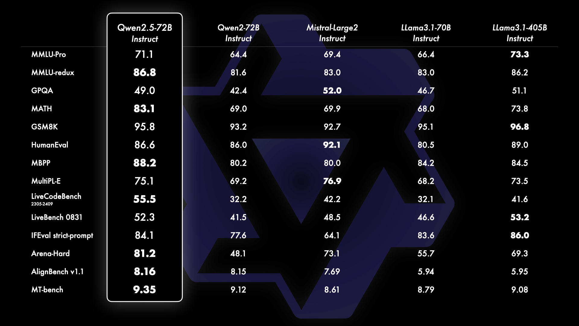 Qwen2.5涵盖多个尺寸的大语言模型、多模态模型、数学模型和代码模型,每个尺寸都有基础版本、指令跟随版本、量化版本,总计上架100多个模型,刷新业界纪录。