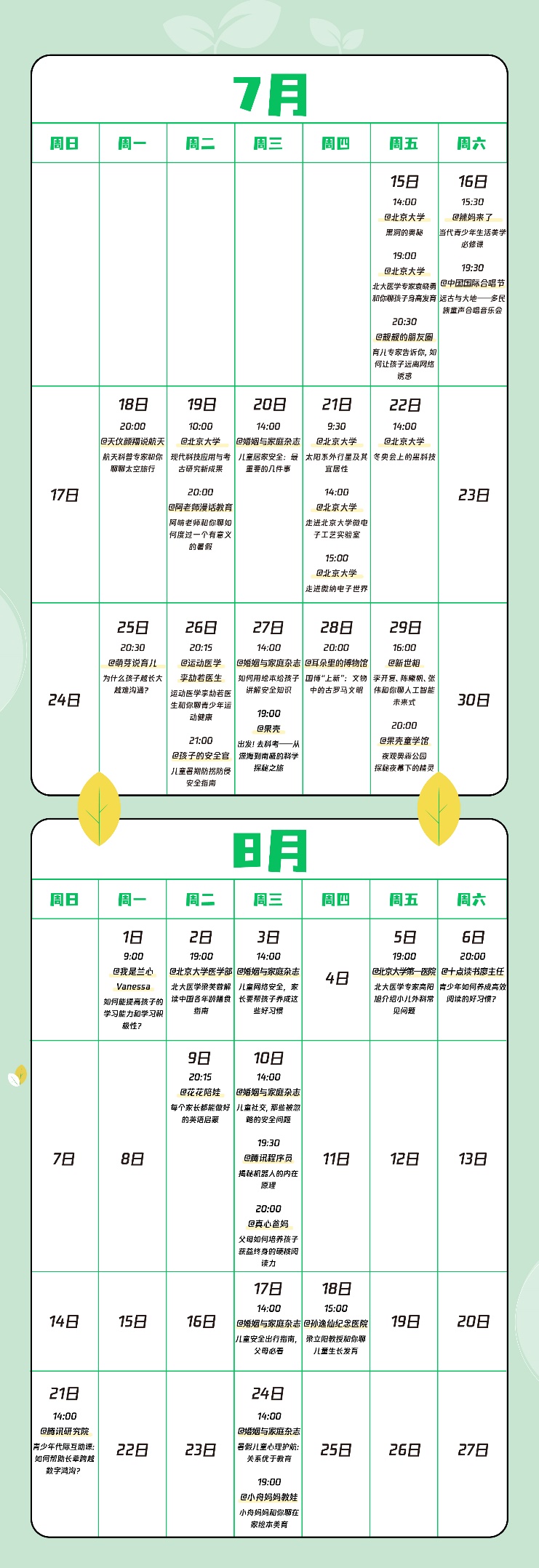 据介绍,微信绿苗计划·暑期公开课,也是微信“八点一刻”系列知识直播的“绿苗专场”,按照知识领域分为智能编程课、亲子教育课、青少年暑期安全课、科普知识课、文化素养课、卫生健康课等课程,每周稳定开播。北京大学、《婚姻与家庭》杂志、北京大学医学部、北京大学第一医院、果壳、果壳童学馆、新世相等多个社会知名高校、机构、专家纷纷加入微信绿苗计划·暑期公开课计划,在暑期里为青少年带来多个领域生动详实、寓教于乐的知识直播。