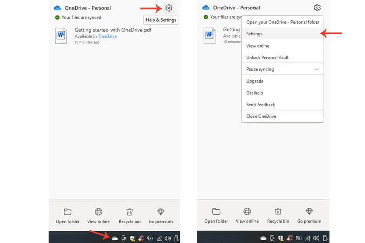 第1步:单击任务栏中的 Microsoft OneDrive,单击“帮助”,选择设置图标,然后选择设置。
