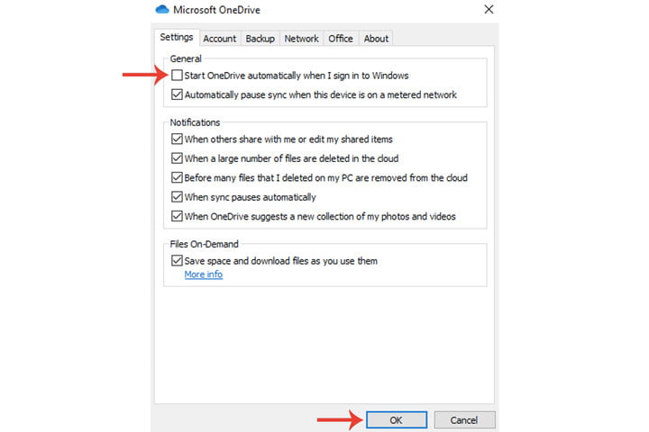 第2步:取消选择登录 Windows 时自动启动 OneDrive 字段,然后单击“确定”。