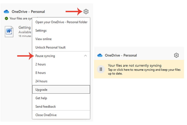 第3步:为方便起见,Microsoft还提供了在特定时间段内暂时禁用 OneDrive 的功能。单击任务栏中的 Microsoft OneDrive,单击帮助和设置图标,然后单击暂停同步。你可以暂时禁用 OneDrive 2 小时、8 小时或 24 小时。