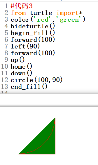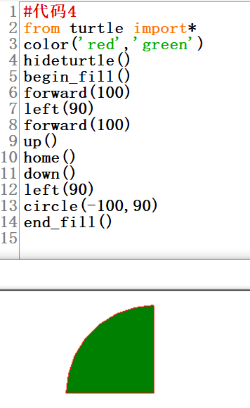 通过试验和分析,我总结出一个结论:涉及到圆弧图形的填充时,默认为弧线内填充(圆心和弧线之间)。当需要外侧填充时,必须是用turtle顺次画出的封闭曲线才能正常填充。根据我们总结的规律,将实例三做修改,经过测试,证明了这结论正确(图7)。