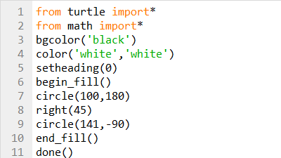 同样,代码第8行半径和角度,第9行的距离,也是我一点点修改、测试出来的。运行效果如图,发现月牙大了(图9)。