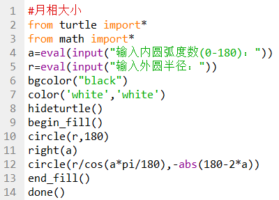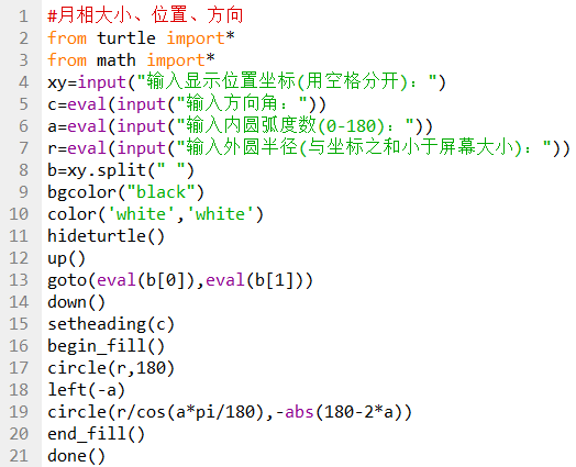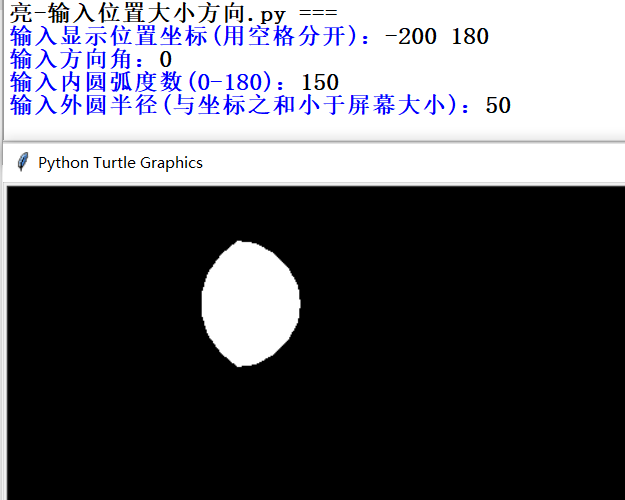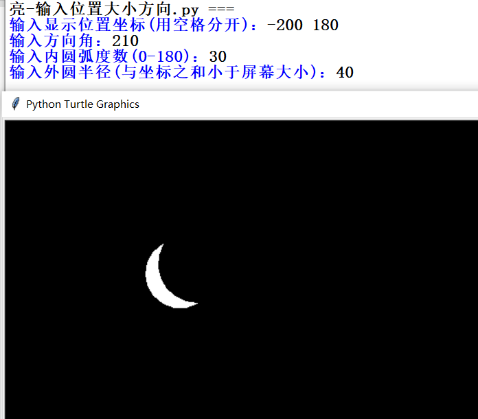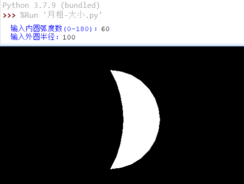 运行程序,输入月亮位置坐标、月亮的朝向、内圆弧度数和外圆半径,即可画出任意方向和大小的月亮。注意外圆半径与西医综合横纵坐标之和不能大于屏幕尺寸(图15)。