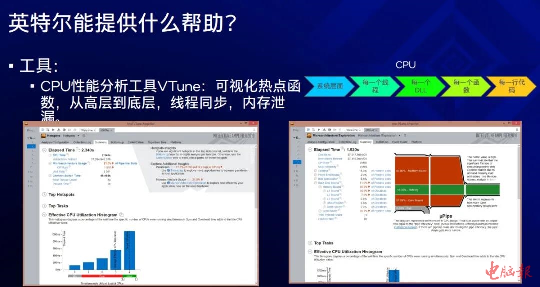 为此,英特尔推出了CPU和GPU性能分析工具Vtune和GPA,用可视化形式,从高层到底层,逐个问题查找,每个线程,每个DLL,每行代码;每一个Shader,每一个参数,逐个问题解决,逐个进行优化。