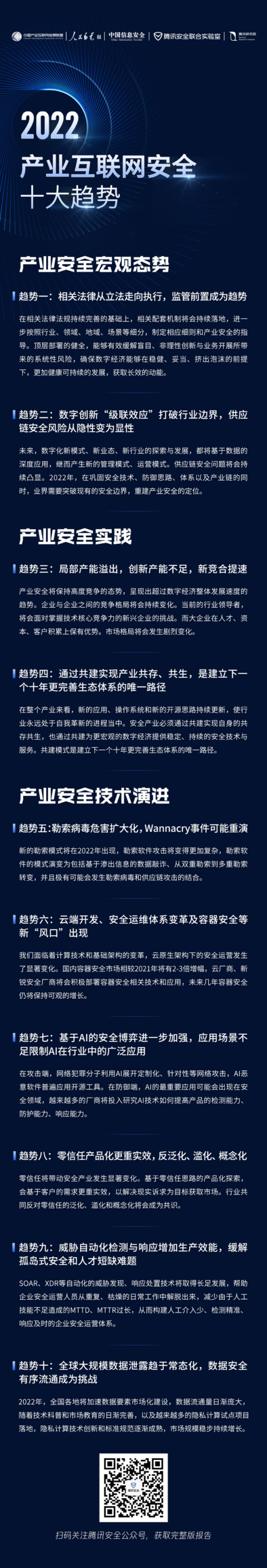2月28日,在中国产业互联网发展联盟指导下,人民邮电报、中国信息安全、腾讯安全联合实验室、腾讯研究院联合推出《2022产业互联网安全十大趋势》。该报告由《中国信息安全》杂志出品人温哲、腾讯副总裁丁珂、腾讯研究院院长司晓等20余位行业顶级专家、学者、智库及企业领袖历时三个月共同研判产出。报告围绕“产业安全宏观态势”、“产业安全实践”、“产业安全技术演进”三大维度,面向年度行业趋势进行分析和研判,为产业数字化发展提供参考和指引。