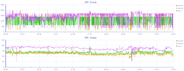 天玑8100-MAX的4个A78大核平均频率稳定在1.8GHz左右,其中3个大核利用率在50%到60%左右,1个A78大核达87%以上,看频率还比一加 Ace高一点,但两者都属于天玑8100-MAX正常的性能范围。