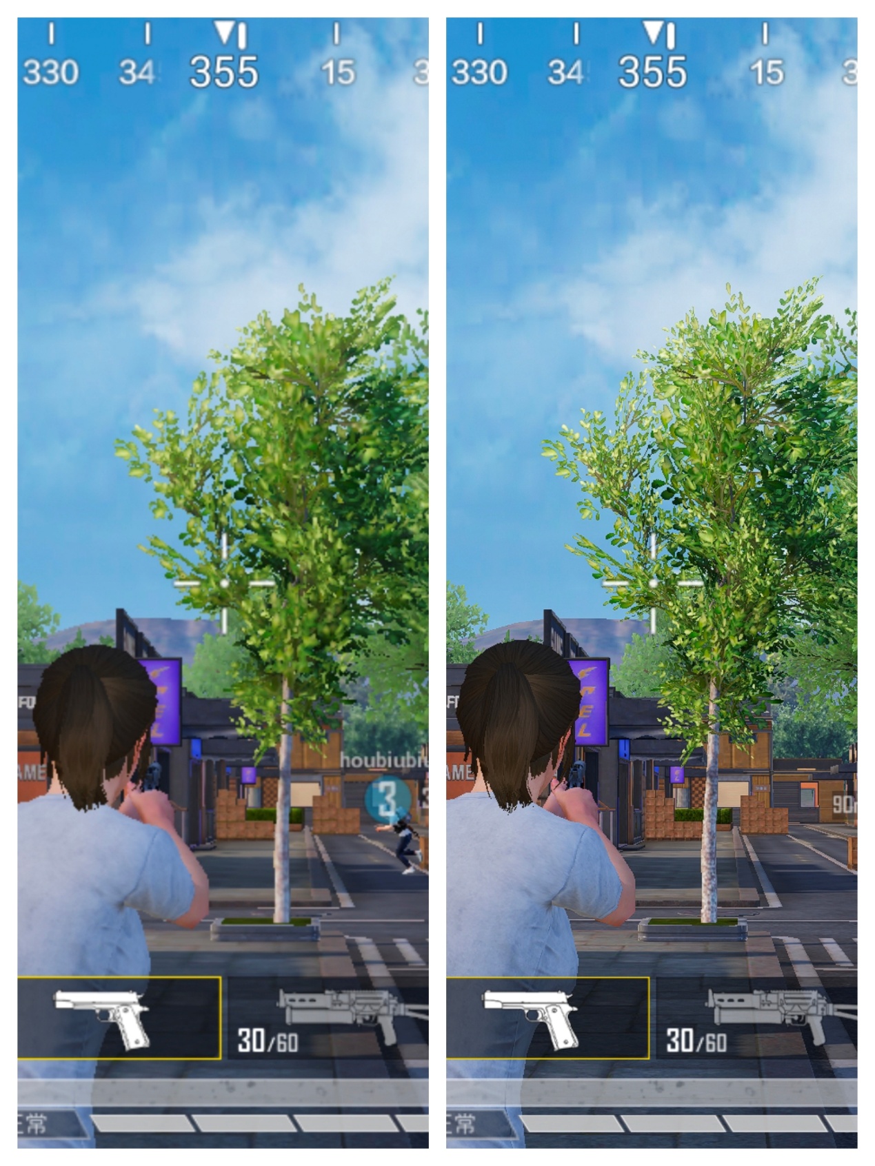 以《和平精英》为例,开启侧滑菜单中的游戏超分—超高画质就可启用1.5K超分,画面清晰度对比游戏原生的HDR高清有了质的飞跃,效果高下立判。开启超高画质后,系统会自动开启超分,将帧数提升到144帧,带来更顺滑的游戏体验。