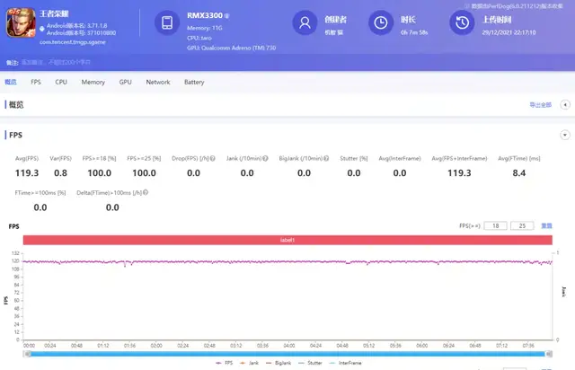 在《王者荣耀》中,如果不打开GT模式,游戏帧数会限制在60帧。但是开启之后,游戏帧数会提升120帧左右,平均帧数为119.3帧,帧数稳定,游戏运行流畅,没有出现卡顿掉帧。