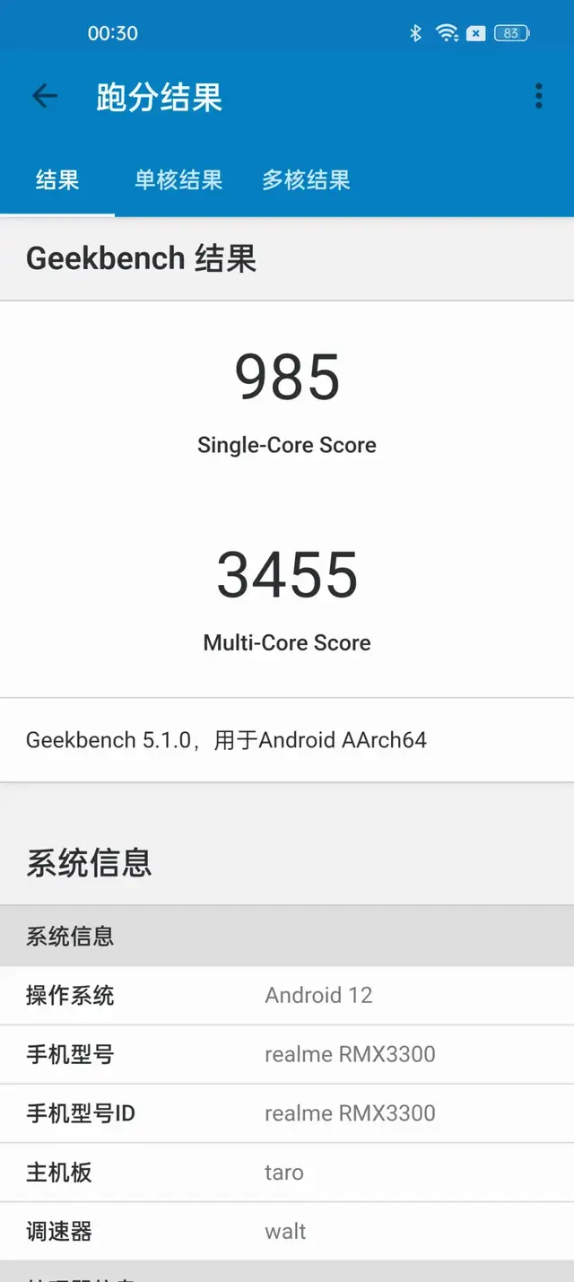 在测试CPU性能的Geekbench4中,真我GT2 Pro单核跑分985分,多核跑分3455分,这部分分数稍低,还有一定的挖掘空间。但鉴于手机目前还是测试版本,后续零售机的CPU性能应该会更好一点。