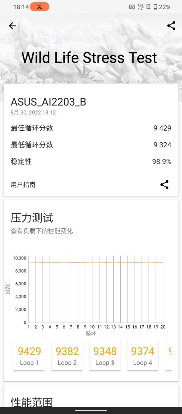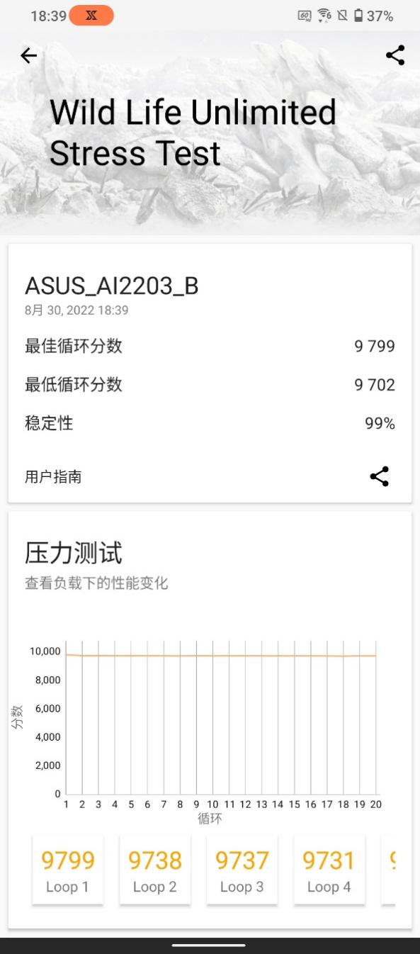 3DMARK的测试成绩中,其Wild Life 循环测试和Wild Life Unlimited循环测试的稳定性分别达到了98.9%和99%。从成绩来看,ROG6天玑至尊版的长时间重负荷压力测试表现比较不错,性能不会因为时间的推移而有较大的降低。